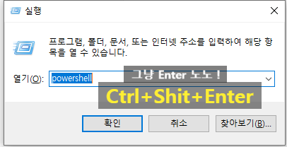실행 (Ctrl+R) > powershell (Ctrl+Shit+Enter) > 아래 명령어 입력 후 Enter